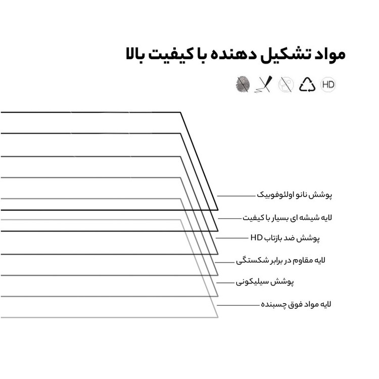 ویژگیها: 9H , جلوگیری از انعکاس نور , قابلیت نصب آسان , مقاوم در برابر چربی و اثرانگشت , مقاوم در برابر خط و خش