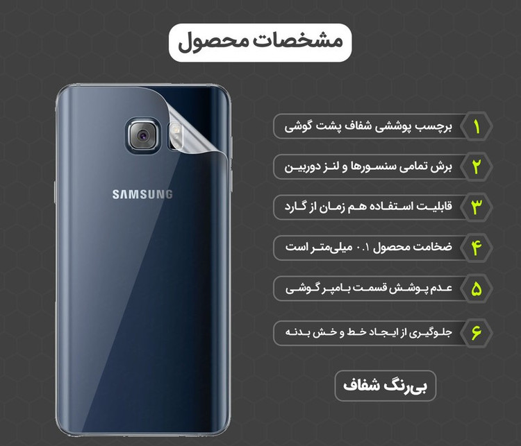 محافظ صفحه نمایش مولتی نانو MULTINANO محافظی کاملا شفاف و بدون حاشیه رنگی است که از ضخامت 0.2 میلی متری برخوردار است. این محافظ از متریال نانو ساخته شده ( شیشه ای نمیباشد) که در برابر ضربه و خط و خش از گوشی شما محافظت میکند. محافظ صفحه نمایش (گوشی موبایل Samsung Galaxy Note 5) بسیار شفاف است و به مرور زمان کدر نمیشود به همین امر کیفیت صفحه نمایش گوشی شما همیشه در حالت اولیه قرار دارد. پوشش دوربین سلفی از دیگر ویژگی های این محافظ میباشد تا دغدغه شمارا برای تمیز کردن لنز دوربین از بین ببرد.عملکرد حسگر اثرانگشت با این محافظ دچار تداخل نمیشود. نقطه قوت محافظ صفحه نمایش (گوشی موبایل سامسونگ گلکسی نوت 5) این است که به صورت اختصاصی برای گوشی شما طراحی شده است و نمونه مشابه دیگری ندارد. محافظ پشت گوشی مولتی نانو MULTINANO ضخامت کمی دارد تا ظرافت گوشی شما را حفظ کند و همچنین ازپشت گوشی شما در برابر خط و خش محافظت میکند. گرد و غبارهایی که بین کاور و بدنه گوشی قرار میگیرند به مرور زمان باعث ایجاد خط و خش هایی روی بدنه گوشی شما میشوند. محافظ پشت (موبایل سامسونگ Galaxy Note 5) بهترین راه حل برای مقابله با این خط و خش هاست. این محصول به دلیل انعطاف پذیری بالا به خوبی لبه های خمیده را پوشش میدهد.