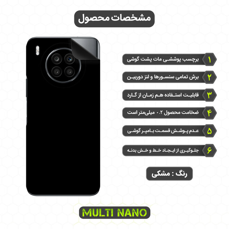 برچسب پوششی مات Multi Nano به منظور محافظت در برابر خط و خش و ایجاد طرح و رنگی نو برای پشت گوشی موبایل شما طراحی و تولید شده است. به مرور زمان گرد و غبارهایی که بین گارد و پشت گوشی قرار میگیرند، خط و خشهایی روی بدنه ایجاد میکنند که باعث کاهش زیبایی و همچنین کاهش ارزش گوشی شما میشود. پیشنهاد میشود در کنار کاور های شفاف یا دور رنگی موجود در بازار، از برچسب پوششی مات مولتی نانو استفاده کنید تا گوشی شما در برابر آسیب های احتمالی در امان باشد. جنس این برچسب به گونهای است که ثبات رنگ دارد و رنگ آن به مرور زمان تغییر نمیکند، این برچسب به منظور پوشش پشت بدنه و قسمت دوربین گوشی ( موبایل Honor 50 Lite ) طراحی و تولید شده است و اطراف گوشی را پوشش نمیدهد. ضخامت این برچسب 0.2 میلیمتر می باشد، که از ظرافت گوشی شما کم نمیکند و ظاهری جذاب و متفاوت به گوشی ( موبایل آنر 50 لایت ) میدهد.
