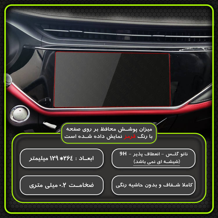 امروزه خودروها دارای دستگاه پخش هوشمند، با صفحه نمایش لمسی و ابعادی متنوع هستند و محافظت از این نوع مانیتور ها در برابر ضربات احتمالی و ایجاد خط و خش، یکی از مهمترین دغدغه های صاحبان خودرو به شمار می آید. شرکت مولتی نانو به صورت کاملا دقیق و با به روز ترین متد های اندازه گیری، محافظ هایی با ابعاد کاملا انحصاری برای نمایشگر های هوشمند خودروها طراحی ، تولید وعرضه کرده است. محافظ صفحه نمایش انعطاف پذیر نانو Multi Nano مناسب برای مالتی مدیا مانیتور فابریک خودرو Chery Arrizo 6 Pro (ابعاد محافظ 264x129 میلیمتر) بوده و بر روی این مانیتور قابل نصب است. محافظ نمایشگر خودرو مولتی نانو، نسل جدید محافظ های صفحه نمایش، با ساختاری شفاف که از تکنولوژی نانو در ساخت آن استفاده شده و از ضخامت 0.2 میلی متری برخوردار میباشد(شیشه ای نمی باشد) و باعث مقاومت بسیار بیشتر در برابر ضربه نسبت به گلس های معمولی شده است، همچنین کاملا نشکن است و در صورت برخورد ضربه نخواهد شکست، و به مرور زمان کدر نخواهد شد و لمس آن با توجه به ساختار تکنولوژی روغنی بسیار آسان و روان است. توجه داشته باشید که این محصول دارای برچسب اول (قبل از نصب) و برچسب دوم (بعد از نصب) می باشد و داخل بسته بندی محصول برای سهولت در نصب، لوازم کامل به همراه آموزش نصب نیز وجود دارد.xxxشما میتوانید ویدئو آموزش نصب و تست مقاومت محافظ بر روی مانیتور را در آپارات و شبکه های مجازی مشاهده کنید.xxx