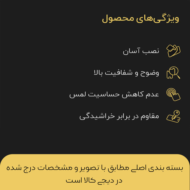 ویژگیها: قابلیت نصب آسان , 9H , جلوگیری از ایجاد خط و خش , نصب بدون حباب , جلوگیری از انعکاس نور , مقاوم در برابر خط و خش , مقاوم در برابر چربی و اثرانگشت