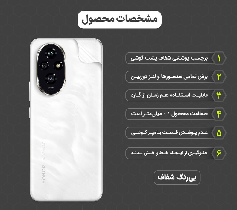 شامل یک عدد محافظ شفاف پشت گوشی - پد الکلی - برچسب پرز بردار - دستمال مناسب برای تمیز کردن گوشی - کارت نصب - آموزش نصب