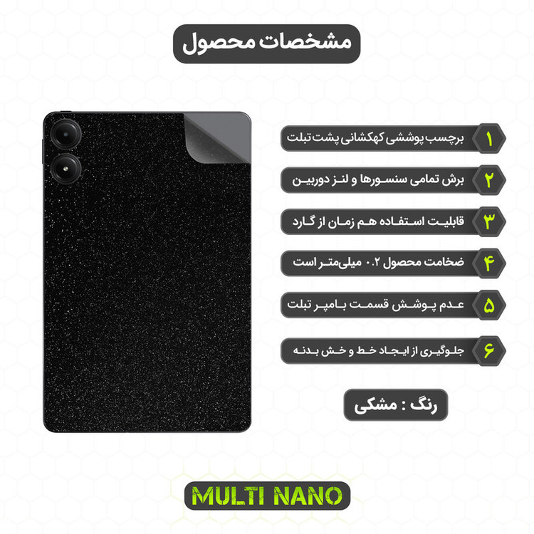 برچسب پوششی طرح کهکشانی Multi Nano به منظور محافظت در برابر خط و خش و ایجاد طرح و رنگی نو برای پشت تبلت شما طراحی و تولید شده است. به مرور زمان گرد و غبارهایی که بین گارد و پشت تبلت قرار میگیرند، خط و خشهایی روی بدنه ایجاد میکنند که باعث کاهش زیبایی و همچنین کاهش ارزش تبلت شما میشود. پیشنهاد میشود در کنار کاور های شفاف یا دور رنگی موجود در بازار، از برچسب پوششی کهکشانی مولتی نانو استفاده کنید تا تبلت شما در برابر آسیب های احتمالی در امان باشد. جنس این برچسب به گونهای است که ثبات رنگ دارد و رنگ آن به مرور زمان تغییر نمیکند، همچنین این محصول خاصیت ضد لک و ضد اثر انگشت دارد، که تجربه بهتری برای شما رقم میزند. این برچسب به منظور پوشش پشت بدنه (Xiaomi Redmi Pad Pro 2024) طراحی و تولید شده است و اطراف تبلت را پوشش نمیدهد. ضخامت این برچسب 0.2 میلیمتر می باشد، که از ظرافت تبلت شما کم نمیکند و ظاهری جذاب و متفاوت به تبلت (شیائومی ردمی پد پرو) میدهد.