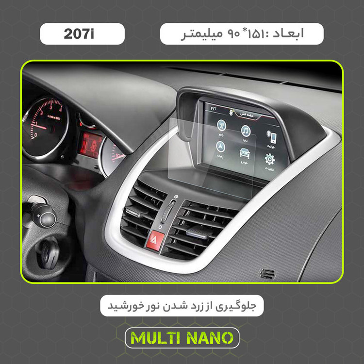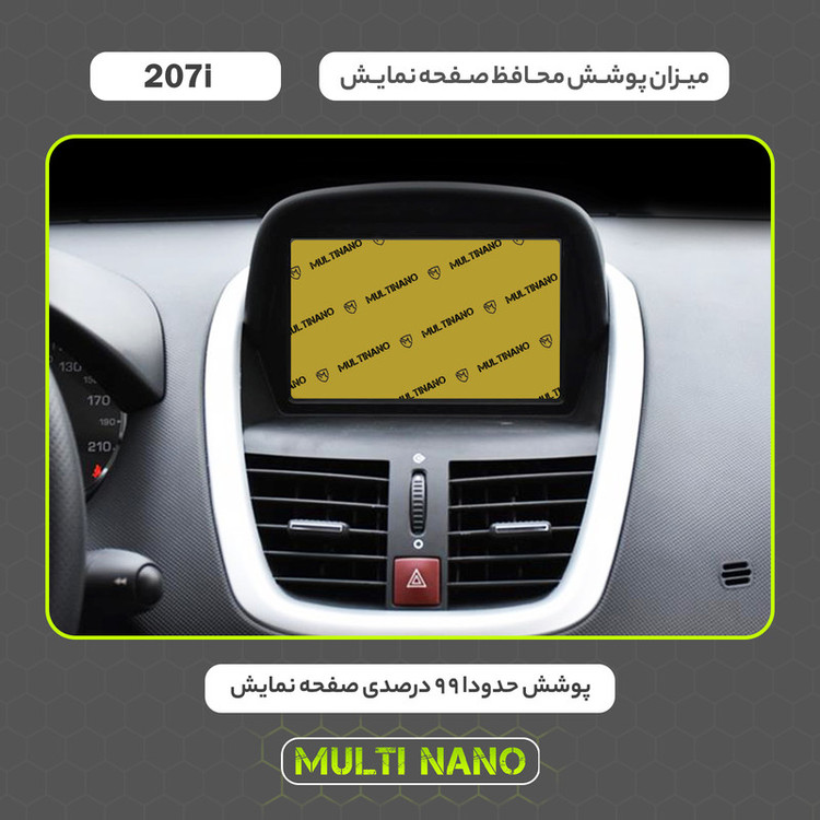 امروزه خودروها دارای دستگاه پخش هوشمند، با صفحه نمایش لمسی و ابعادی متنوع هستند و محافظت از این نوع مانیتور ها در برابر ضربات احتمالی و ایجاد خط و خش، یکی از مهمترین دغدغه های صاحبان خودرو به شمار می آید. شرکت مولتی نانو به صورت کاملا دقیق و با به روز ترین متد های اندازه گیری، محافظ هایی با ابعاد کاملا انحصاری برای نمایشگر های هوشمند خودروها طراحی ، تولید وعرضه کرده است. محافظ صفحه نمایش انعطاف پذیر نانو Multi Nano مناسب برای مانیتور خودرو (پژو 207i) بوده و روی تمامی مانیتورهای این خودرو از جمله مانیتورهای رایان فن کاو اندیش، کروز و سیمیا الکترونیک قابل نصب است. محافظ نمایشگر مولتی نانو، نسل جدید محافظ های صفحه نمایش، با ساختاری شفاف که از تکنولوژی نانو در ساخت آن استفاده شده و از ضخامت 0.2 میلی متری برخوردار میباشد(شیشه ای نمی باشد) و باعث مقاومت بسیار بیشتر در برابر ضربه نسبت به گلس های معمولی شده است، همچنین کاملا نشکن است و در صورت برخورد ضربه نخواهد شکست، و به مرور زمان کدر نخواهد شد و لمس آن با توجه به ساختار تکنولوژی روغنی بسیار آسان و روان است. توجه داشته باشید که این محصول دارای برچسب اول (قبل از نصب) و برچسب دوم (بعد از نصب) می باشد و داخل بسته بندی محصول برای سهولت در نصب، لوازم کامل به همراه آموزش نصب نیز وجود دارد.