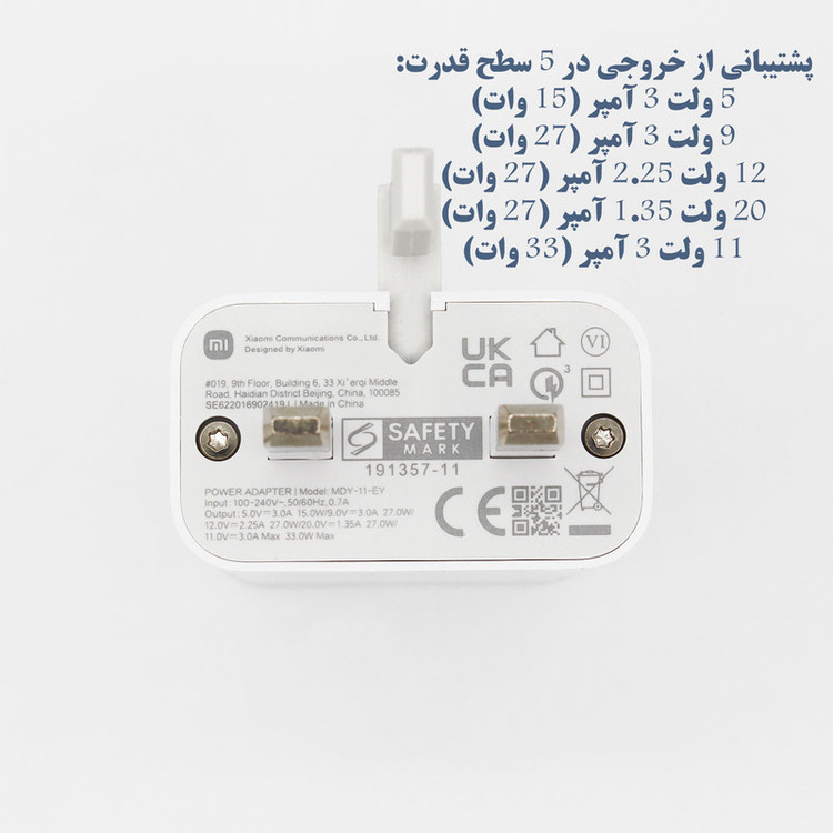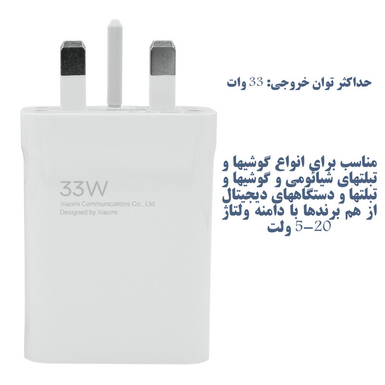 ولتاژ خروجی: 20-5 ولت، حداکثر توان خروجی: 33 وات، کابل 3 آمپری، طول کابل: 1 متر، به همراه یک عدد سوزن سیمکارت، با پک گوشی اصلی