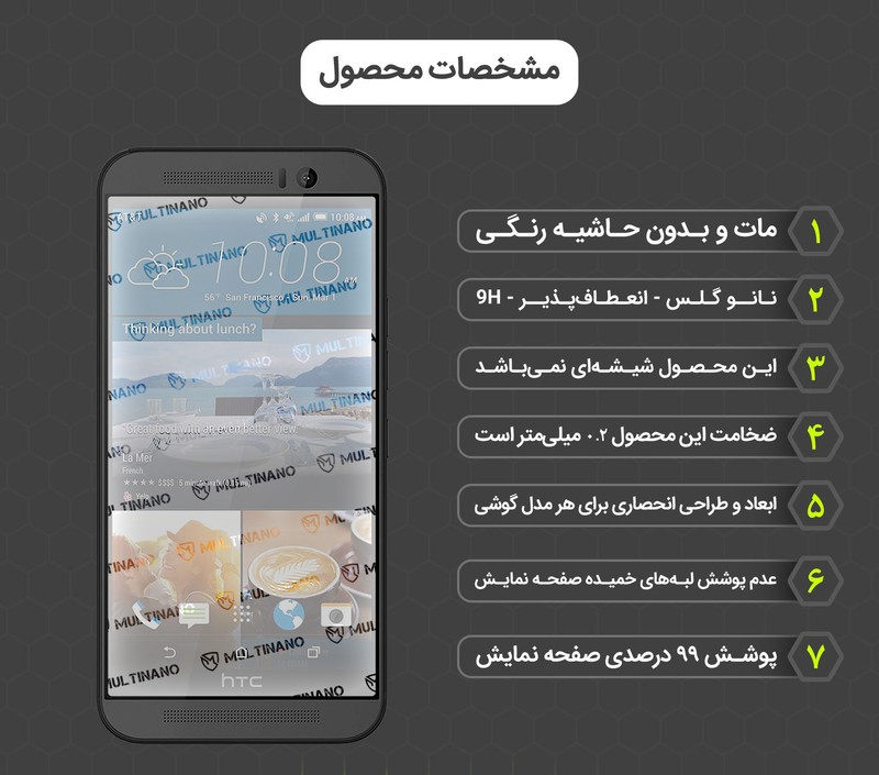 محافظ صفحه نمایش نانو Multi Nano ، گلسی باساختار مات و بدون حاشیه رنگی که توسط فناوری نانو ساخته شده و از ضخامت 0.2 میلی متری برخوردار است.(شیشه ای و تلق نمی باشد) و بخاطر نانو بودن باعث مقاومت بسیار بیشتر در برابر ضربه نسبت به گلس های معمولی است، همچنین کاملا نشکن است و در صورت برخورد ضربه نخواهد شکست. مات بودن این گلس باعث میشود تا نور روی صفحه پخش شود. از صفحه نمایش گوشی موبایل (اچ تی سی وان ام 9 پلاس) در برابر ضربات احتمالی , خط و خش و... محافظت میکند. محافظ صفحه نمایش مات نانو مولتی نانو قسمت های خمیده (curved) صفحه گوشی را پوشش نمیدهد اما برای گوشی هایی که خمیدگی ندارند، صفحه نمایش را به خوبی پوشش میدهد. با توجه به ضخامت کم این محصول نسبت به گلس های 3 میل، برای گوشی هایی که حسگر اثر انگشت آن روی صفحه نمایش تعبیه شده اند، نیز پیشنهاد میشود.