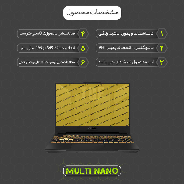 اگر شما هم از لپتاپ ایسوس TUF Gaming F15 FX507ZC4 2022 15.6 inch استفاده میکنید و نگران خط و خشهای احتمالی و آسیب روی صفحه نمایش خود هستید، محافظ صفحهنمایش شفاف مولتی نانو یک انتخاب عالی برای شماست. این محافظ با طراحی دقیق از مواد نانو، مواد سیلیکونی و مقداری شیشه ساخته شده تا از صفحهنمایش شما در برابر آسیبهای روزمره مانند خط و خش، ضربه و گرد و غبار محافظت میکند. ویژگی مهم این محافظ شفاف بودن آن است که هیچ تاثیری بر کیفیت تصویر، رنگها و وضوح صفحهنمایش ندارد و باعث حفظ طبیعیترین تجربه مشاهده میشود.این محافظ صفحه نمایش با ضخامت نازک و طراحی دقیق، به راحتی روی صفحهنمایش نصب میشود. علاوه بر این، با ویژگی کاهش جذب اثر انگشت و لکهها، صفحهنمایش شما همیشه تمیز و واضح باقی میماند. نصب آن بسیار ساده است و بهوسیله برچسبهای جداشونده، شما میتوانید محافظ را به دقت در مرکز صفحهنمایش تنظیم کرده (به هیچ عنوان از گوشه فیکس نکنید)و سپس برچسب شماره دو را جدا کنید تا نصب به طور دقیق و بدون مشکل انجام شود.محافظ صفحهنمایش شفاف مولتی نانو مناسب برای لپ تاپ ایسوس TUF Gaming F15 FX507ZC4 2022 15.6 inch بهطور اختصاصی طراحی شده تا با ابعاد دقیق صفحهنمایش شما مطابقت داشته باشد، بدون اینکه از کیفیت صفحه یا حس لمسی دستگاه شما کاسته شود. این محافظ انتخابی ایدهآل برای کسانی است که میخواهند از صفحهنمایش لپتاپ خود در برابر آسیبها محافظت کرده و در عین حال از کیفیت تصویر طبیعی و شفاف دستگاه لذت ببرند.