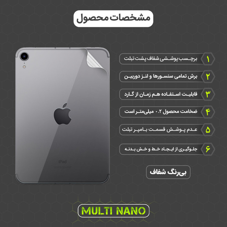 اگر میخواهید ظاهر لوکس و طراحی چشمنواز تبلت اپل iPad Mini 8.3 inch 2021 شما بهوضوح دیده شود و در عین حال از آسیبهای احتمالی در امان بماند، محافظ پشت شفاف هیدروژل مولتی نانو مدل X-F1T انتخابی هوشمندانه و حرفهای است. این محصول از متریال PPF (هیدروژلی خودترمیمشونده) ساخته شده و با ضخامت بسیار کم (حدود ۰.۲ میلیمتر)، بدون افزودن وزن یا تغییر در فرم ظاهری دستگاه، از بخش پشتی بدنه در برابر خط و خش ناشی از سایش، گرد و غبار و تماسهای روزمره محافظت میکند. طراحی آن بهگونهای است که لبههای دستگاه را نمیپوشاند، در نتیجه میتوانید بهراحتی از انواع کاورها و کیبوردهای مغناطیسی نیز استفاده کنید. برخلاف تصور رایج که گارد بهتنهایی کافی است، گرد و غبار جمعشده بین قاب و بدنه میتواند به مرور زمان به بدنه آسیب بزند، از اینرو استفاده از محافظ شفاف ضدخش، نهتنها در حفظ ظاهر آیپد مؤثر است بلکه ارزش آن را نیز حفظ میکند. این محافظ با نصب آسان، چسبندگی بالا، خاصیت خودترمیمی و شفافیت بینقص، گزینهای ایدهآل برای کاربرانیست که به دنبال محافظتی مطمئن و نامحسوس برای دستگاه خود هستند.