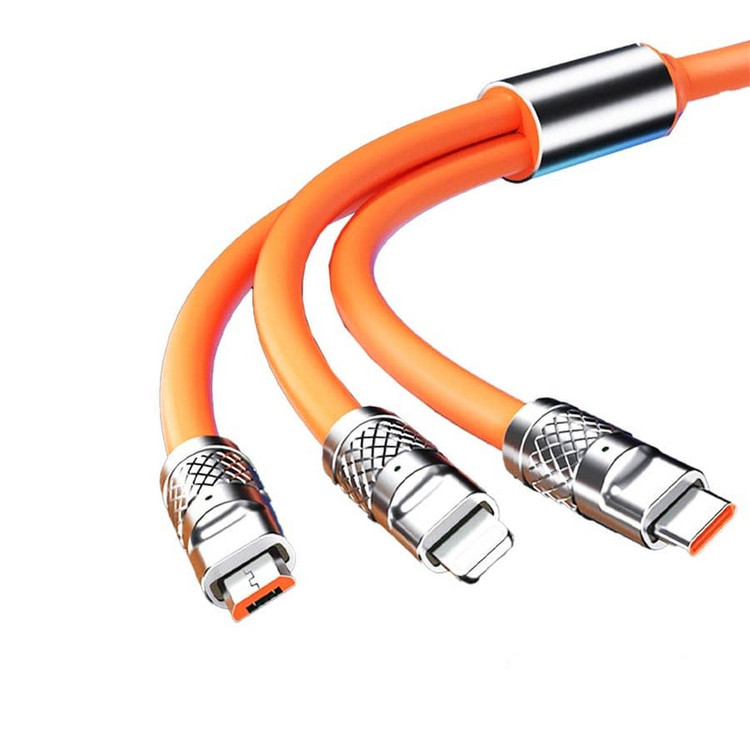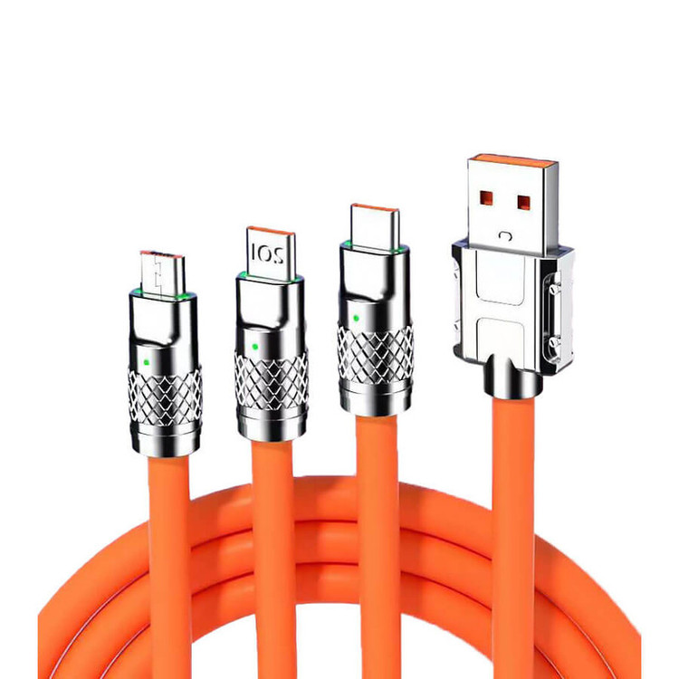 کابل شارژ 120 واتی 6 آمپر ضخیم سه کاره 120 سانت طول دارد که با سری های فلزی و لامپ ال ای دی تجهیز شده است و دارای قابلیت سوپر فست شارژ و انتقال دیتا میباشد این کابل بسیار کارآمد و زیبا است و از کیفیت بالایی برخوردار است این کابل با تمامی درگاه های تایپ سی و لایتنینگ و میکرو سازگار بوده و جنس بدنه کابل کاملا مقاوم بوده و مناسب استفاده مداوم میباشد