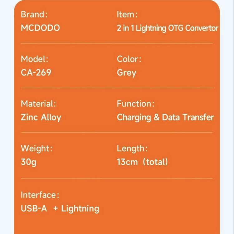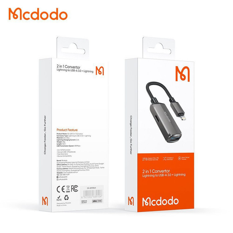مبدل لایتنینگ به USB OTG/لایتنینگ مک دودو مدل CA-2690 ،این تبدیل از بدنه فلزی با آلیاژ روی سند بلاست شده ساخته شده است، و کابل اتصال از نوع کنفی نایلون در هم تنیده شده می باشد که سبب طول عمر بسیار بالای این تبدیل شده است.دارای قابلیت Plug & Use : بعد از اتصال فلش یا هارد دیسک اپلیکیشن “Documents” را در موبایل باز میکنید و نام هارد و فلش خورد را پیدا کرده و عملیات انتقال و کپی فایل رو انجام می دهید و علاوه بر این می توانید در پوشه Files نیز در بخش Browse فلش و هاردی را که به این مبدل متصل نمودید را یافته و اطلاعات را از فلش به موبایل یا بالعکس انجام دهید.همچنینی امکان اتصال موس یا کیبرد را دارید.با این مبدل امکان پخش فیلم و عکس از روی فلش یا هارد (حداکثر 2 ترابایت) را دارید.امکان شارژ همزمان یا انتقال دیتا را نیز با اتصال کابل شارژ به پورت لایتنینگ مبدل دارید. این کالا مبدل لایتنینگ هست برای محصولات آیفون که قابلیت اتصال هارد اکسترنال را به آیفون مک بوک و آیپد ایجاد میکند نکته ای که برای اتصال هارد اکسترنال به آیفون وجود دارد این هست که شارژر آیفون باید از طریق کابل لایتنینگ به پورت موجود در روی این مبدل وصل شود تا برق مورد نیاز برای حرکت و خواندن اطلاعات بر روی دیکستهای هارد فراهم شود سپس هارد را به پورت usb مبدل وصل کنند