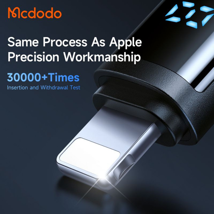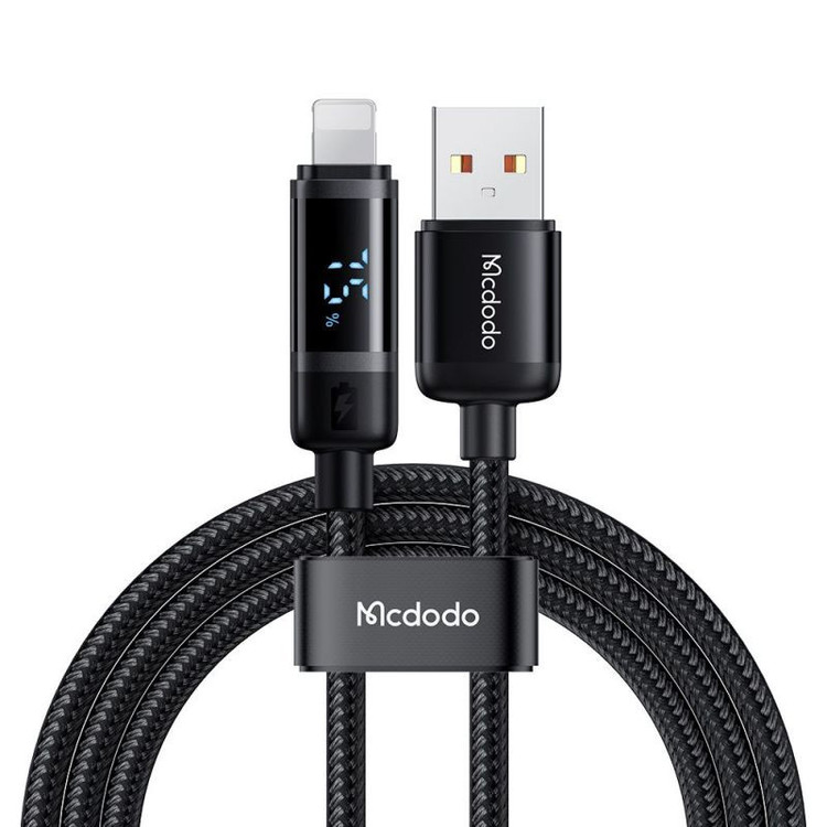 کابل USB به لایتنینگ مک دودو مدل CA-500 طول 1.2 متر ، دارای نشانگر صفحه نمایش دیجیتال برای درصد شارژ آیفون میباشد.کابل مک دودو مناسب انواع آیفون و ایپد و ایرباد دارای پورت لایتنینگ میباشد که در دو رنگ با کد های CA-5001 , CA-5000 شناخته می شود.جریان 3 آمپر را پشتیبانی می نماید که برای تمام مدل های آیفون (لایتنینگ) مناسب میباشد.این کابل از چهار رشته کابل مسی نازک تقویت شده و درهم تنیده تشکیل شده است. بر روی این کابل روکشی کنفی از جنس نایلون و آلومینیم قرار داده شده است با این روکش، کابل شما در برابر کشیده شدن و پارگی استحکام بیشتری خواهد داشت. همچنین جنس کانکتورهای این کابل فلزی و از آلیاژ آلومینیوم است و مقاومت بالایی در برابر فشار و ضربه دارند، قسمت دیگر کانکتور هم از روکش محافظ تشکیل شده است. این کابل دارای یک چیپ هوشمند بوده که نسبت به وضعیت گوشی شما جریان مناسب عبوری را تعیین میکند و باعث میشود به گوشی شما آسیب نرسد، به این ترتیب سلامت باتری بهتر حفظ شده و طول عمر بیشتری خواهد داشت. همچنین این کابل دارای قابلیت شارژ سریع برای گوشی هایی که این قابلیت را پشتیبانی میکنند نیز بوده. در زمان استفاده از قابلیت شارژ سریع نگران داغ شدن بیش از حد گوشی خود نباشید زیرا این کابل دارای قابلیت کنترل دمای هوشمند است. شما می توانید همزمان با انتقال دیتا به شارژ کردن گوشی نیز بپردازید. نرخ انتقال داده این کابل حداکثر به 480 مگابیت بر ثانیه میرسد. اینکه به این سرعت برسید یا نه، کاملا به وسیله شما نیز بستگی دارد؛ در صورتی که گوشی یا لپ تاپ شما از این سرعت پشتیبانی کند، می توانید با سرعت حداکثر 480 مگابیت بر ثانیه به انتقال دیتا و اطلاعات بپردازید.تراشه E-Marker داخلی با فناوری MSC خود توسعه یافته MCDODO می تواند به طور هوشمند ولتاژ و جریان را با توجه به توان دستگاه شما مطابقت دهد.