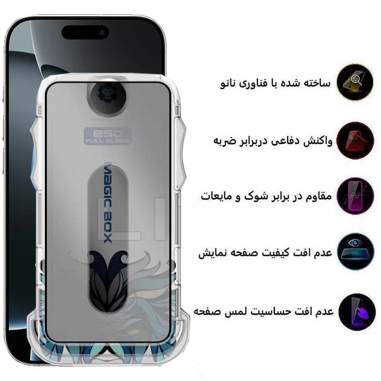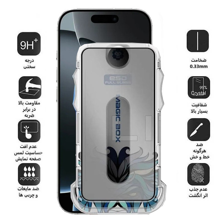 ویژگیها: 9H , مقاوم در برابر چربی و اثرانگشت , مقاوم در برابر خط و خش , نصب بدون حباب , صفحه نمایش , جلوگیری از انعکاس نور , قابلیت نصب آسان