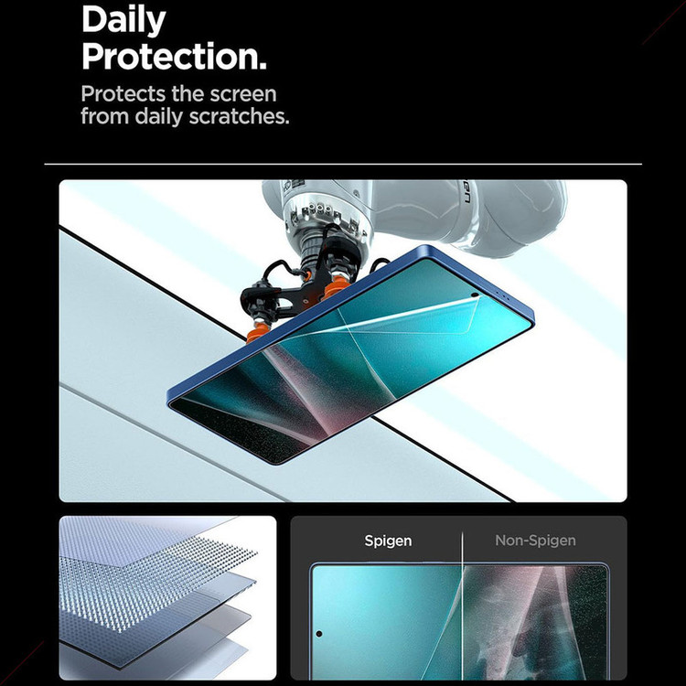 محافظ صفحه نمایش اسپیگن Spigen EliteShield EZ Fit HD مخصوص گلکسی S25 اولترا از جنس **هیدروژل** ساخته شده است (نه شیشه) که با وجود نداشتن مقاومت فیزیکی معادل گلسهای شیشه ای، دارای مزایای منحصر به فردی است. این محافظ با ابزار نصب دقیق و حرفهای عرضه میشود که امکان نصب بینقص و بدون حباب را فراهم میکند. برخلاف محافظهای شیشهای سنتی، این محصول هیدروژلی **کاملاً روی حسگر اثر انگشت و حساسیت لمسی تأثیر منفی نمیگذارد** و عملکرد تاچ اسکرین را دقیقاً مانند حالت بدون محافظ حفظ میکند. از نظر شفافیت تصویر نیز بهدلیل استفاده از فناوری TranSheer Layer، وضوح و رنگهای نمایشگر را بدون افت کیفیت نمایش میدهد که حتی از بسیاری از گلسهای شیشهای معمولی بهتر عمل میکند. همچنین انعطافپذیری ذاتی هیدروژل باعث میشود این محافظ بهراحتی با انحنای نمایشگر گلکسی S25 اولترا تطابق پیدا کند و در عین حال در برابر خط و خشهای روزمره مقاومت مناسبی داشته باشد. اگرچه مقاومت آن در برابر ضربههای شدید به پایه گلسهای شیشهای سخت نمیرسد، اما **برتری آن در حفظ تجربه کاربری طبیعی، شفافیت عالی و عدم ایجاد اختلال در عملکرد سنسورها**، این محافظ هیدروژلی را به انتخابی ایدهآل برای کاربران حرفهای تبدیل کرده است. این محصول دقیقاً برای کسانی طراحی شده که **اولویت آنها عملکرد بینقص نمایشگر بهجای محافظت فیزیکی افراطی** است.