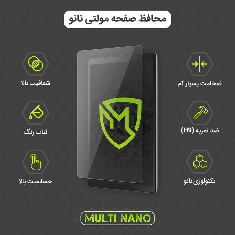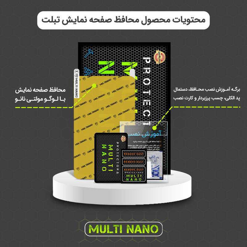 شامل یک عدد محافظ صفحه نمایش بی رنگ شفاف - آموزش نصب ویدئویی - برچسب پرز بردار - کارت نصب - پد الکلی - دستمال مناسب برای تمیز کردن تبلت