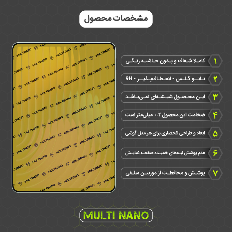محافظ صفحه نمایش شفاف مولتی نانو مدل X-S1N مخصوص تبلت شیائومی Pad 7 Pro 11.2 inch 2024 با ساختاری شفاف و بدون حاشیه رنگی، محصولی منحصر به فرد است که با فناوری نانو و ضخامت 0.2 میلیمتر تولید شده است. این محافظ مقاومت بسیار بالایی در برابر ضربه دارد و امنیت صفحه نمایش را به طور کامل تضمین میکند. ساخته شده از مواد سیلیکونی، نانو و مقداری شیشه به صورت فشرده و با ضخامت کم، این محافظ ضربات را دفع کرده و از آسیب دیدن صفحه نمایش جلوگیری میکند. این محافظ به طور ویژه برای مقاومت در برابر ضربات طراحی شده و برخلاف محافظهای شیشهای، هیچگاه نمیشکند، بنابراین از صفحه نمایش در برابر خطرات مختلف محافظت میکند. شفافیت بالای آن به گونهای است که نه تنها کیفیت تصویر کاسته نمیشود، بلکه به مرور زمان نیز کدر نخواهد شد و تجربه مشاهده تصاویر و ویدئوها با وضوح بالا حفظ میشود. همچنین، ساختار تکنولوژی روغنی این گلس، لمس صفحه نمایش را بسیار روان و آسان میکند. قسمت دوربین سلفی نیز به طور کامل محافظت میشود که علاوه بر نظافت آسانتر، در عملکرد دوربین و سنسورهای مجاور هیچگونه تداخلی ایجاد نمیکند.