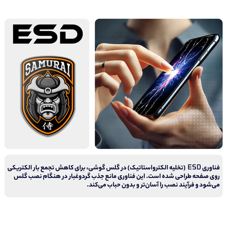 شیشه مقاوم 9H - طراحی تمام صفحه و خمیده 5D - فناوری ESD (تخلیه الکترواستاتیک) ( گلس آنتی استاتیک ) - وضوح شفاف و کیفیت بالا - ویژگی ضد اثر انگشت - طراحی فول چسب - حساسیت لمس بالا -